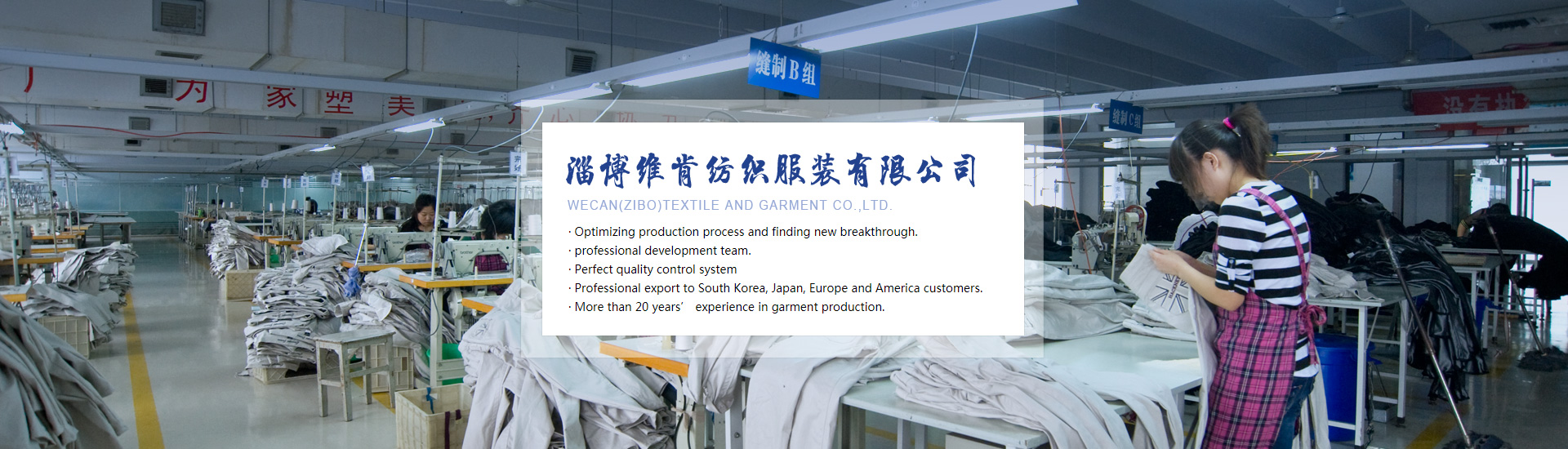 Wecan(Zibo) Textile & Garment Co., Ltd founded in 1998, is a Sino-foreign joint venture specialized in Denim and causal garment producing.